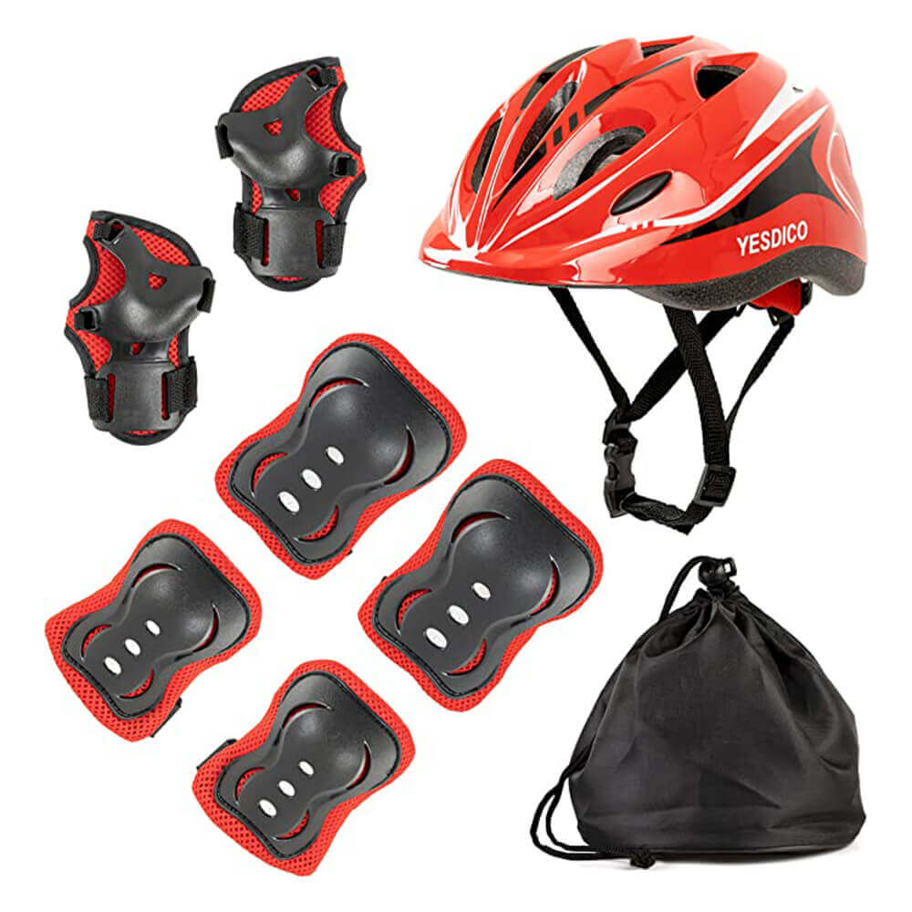 The children protective gear set is a complete set that includes one protective helmet, 2 Knee Pads, 2 Elbow pads 2 Wrist guards, providing full protection for children during outdoor activities.